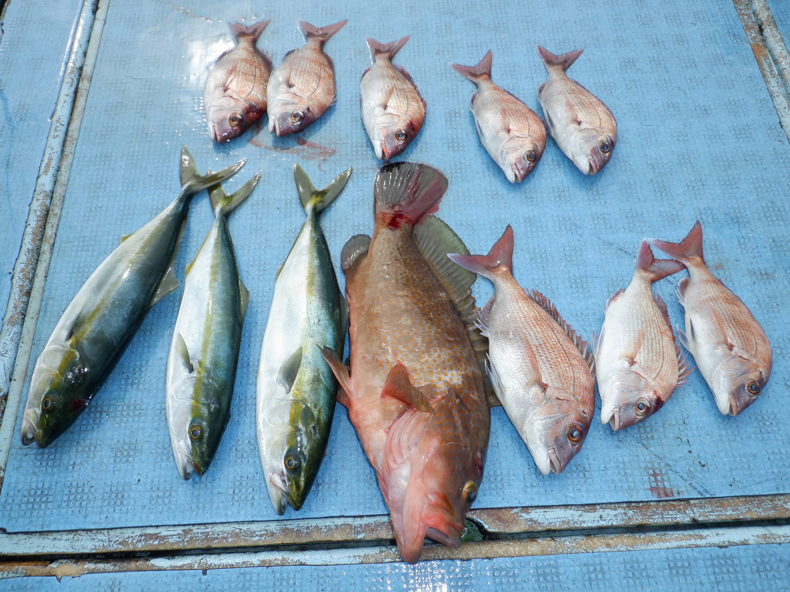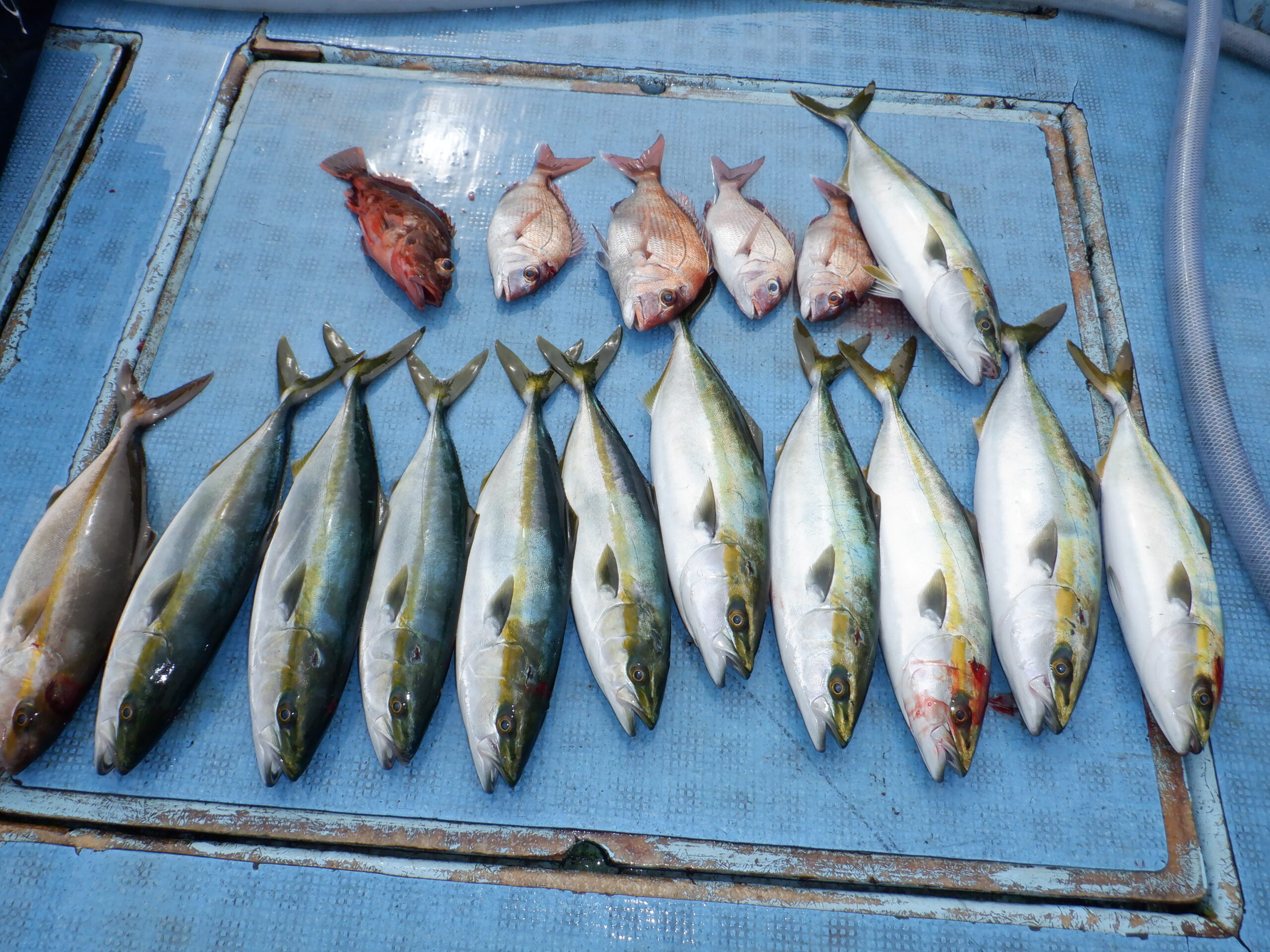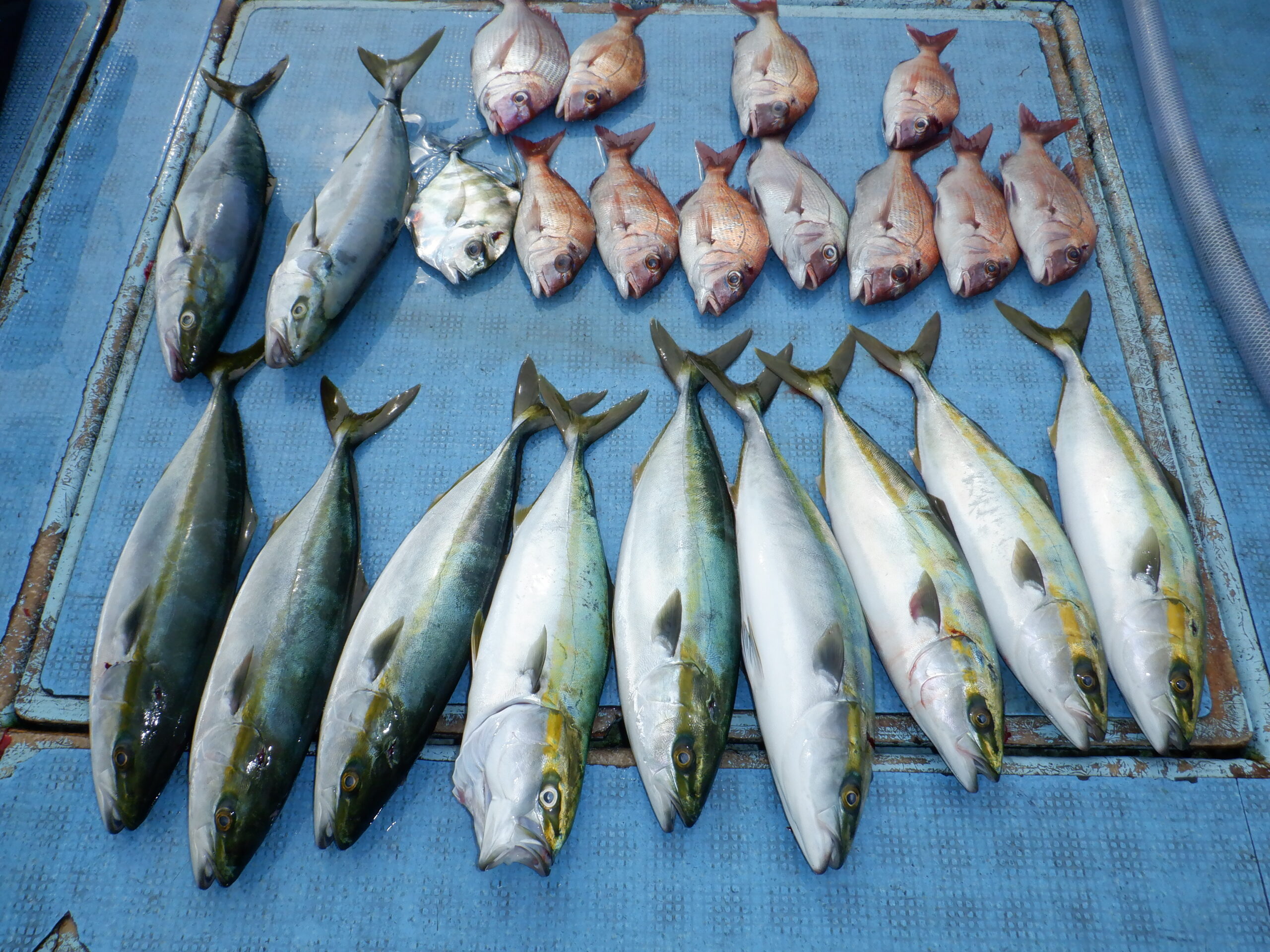 ハマチ~~~~御一行様~!!良型のアズキマスも釣れましたね~真鯛も釣れたが・・サイズアップを目指して明日も頑張るぞ~!(^^)!
