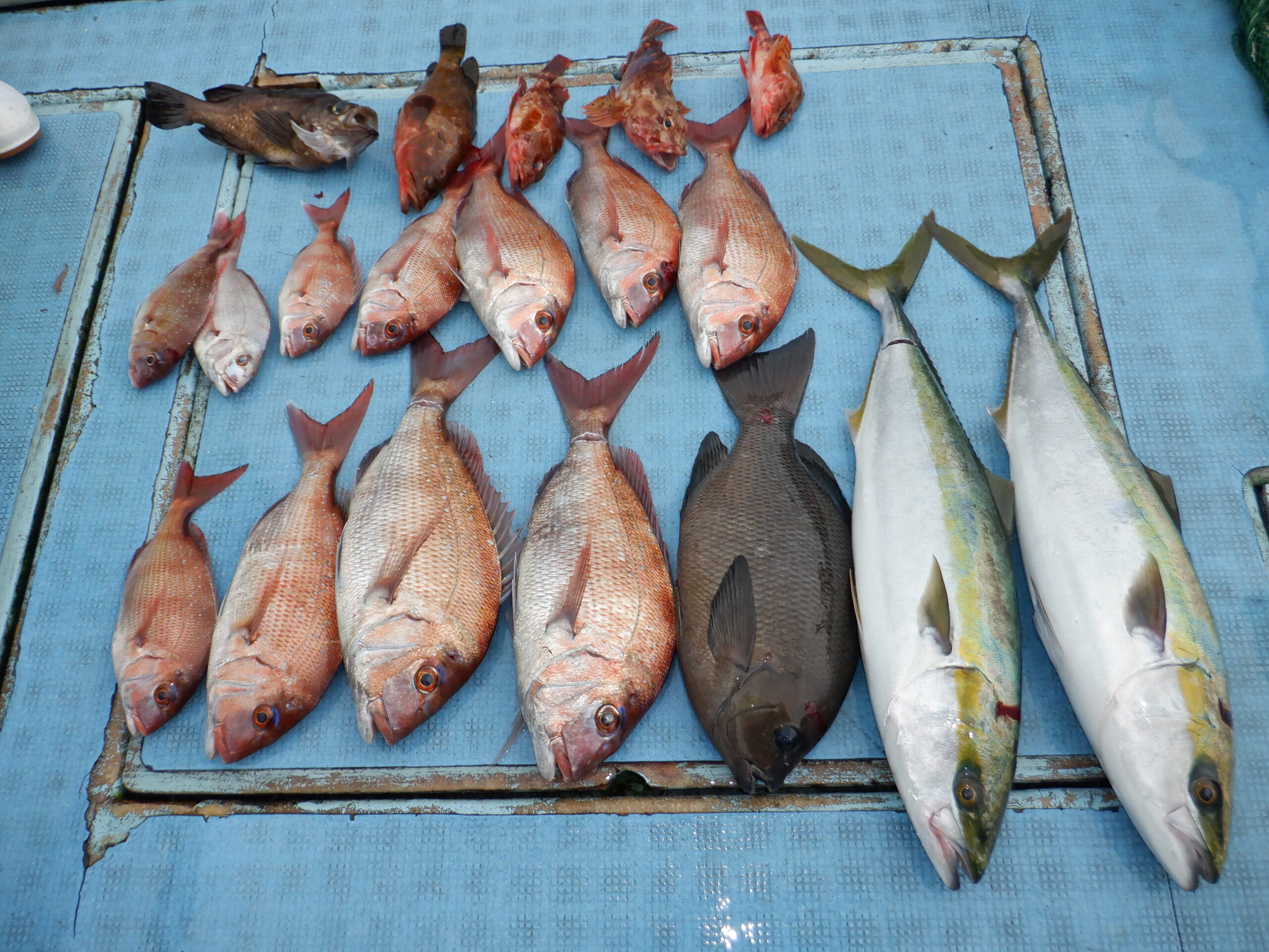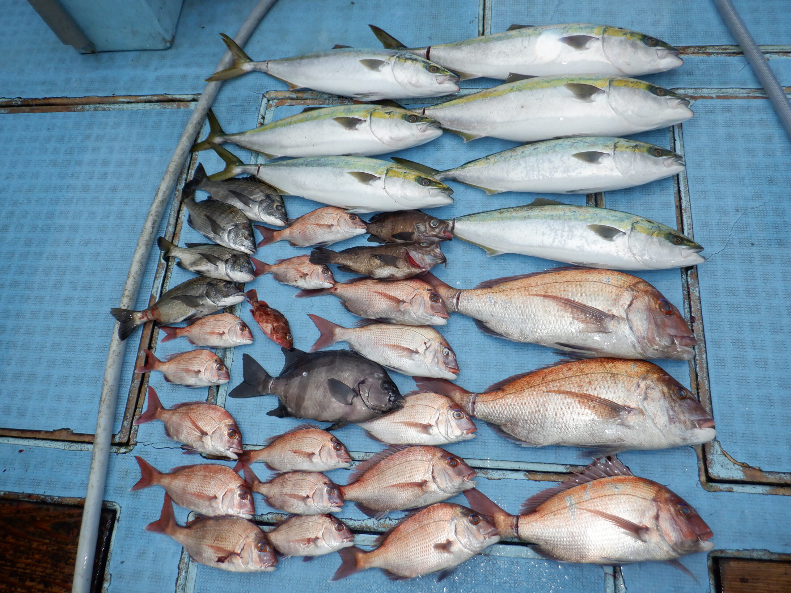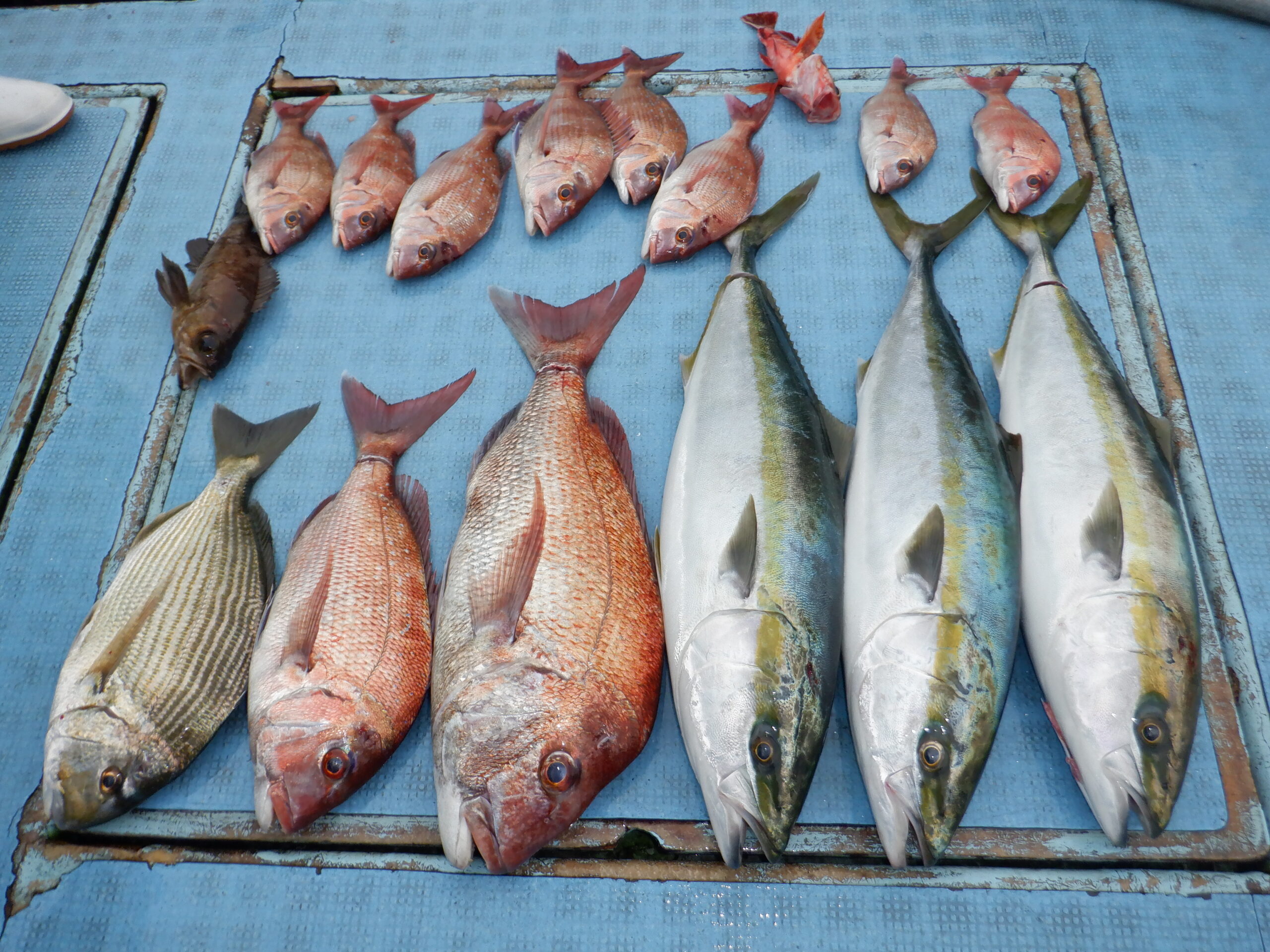 新海さん大鯛2発~(^^)/やったね!!皆さん、良型真鯛・ワラサ・ブリ釣れましたね~惺椰君(高3)3年ぶりの釣りで真鯛・ワラサをダブルでGETしましたね✌