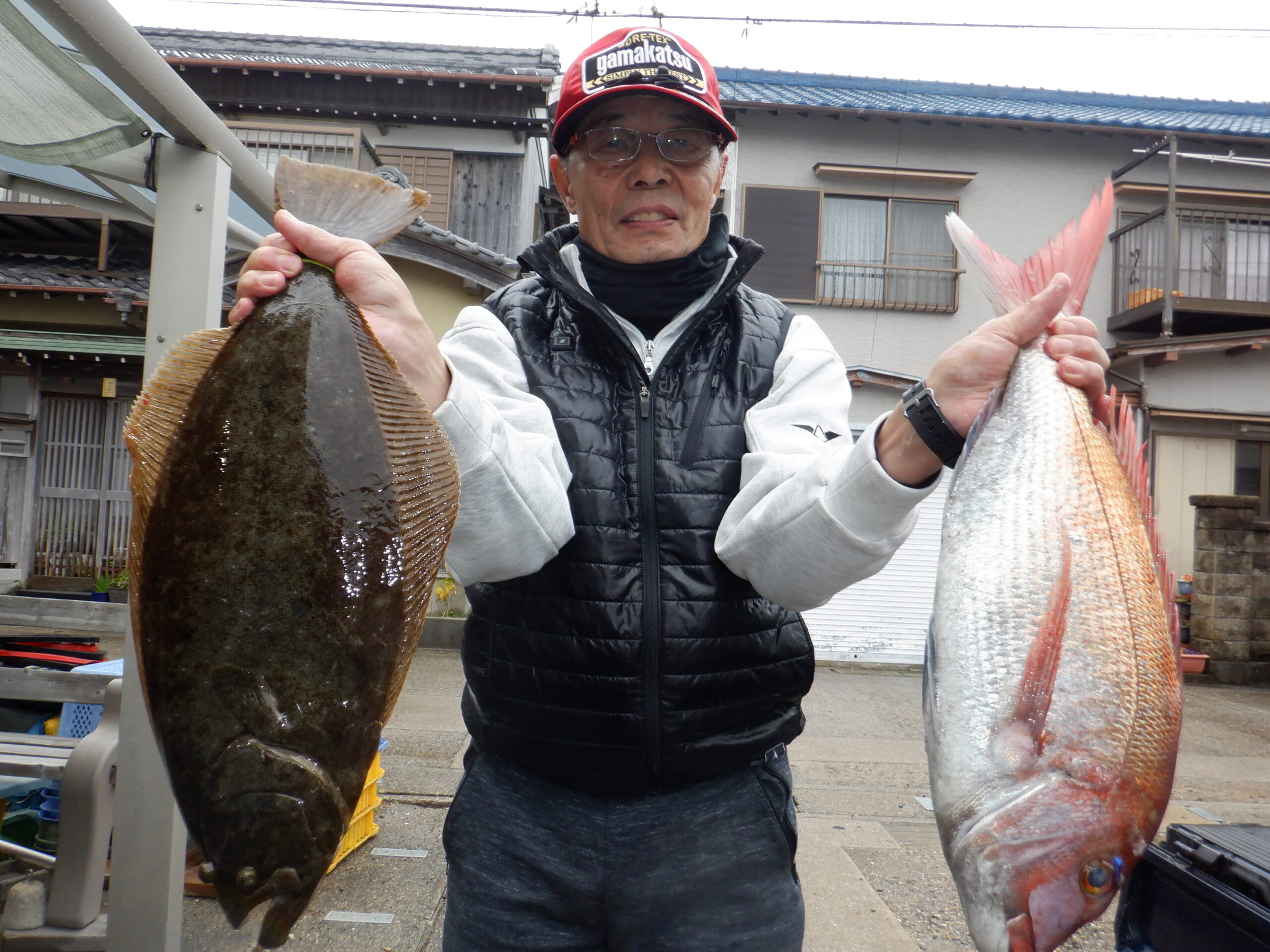 長屋さんら仕立で真鯛80cm・ヒラメ68cm、62cm、田島さんら仕立でヒラメ7...